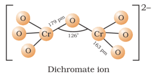 In dichromate ion, two tetrahedral CrO4 units share one oxygen atom with Cr-O-Cr bond angle 126o.